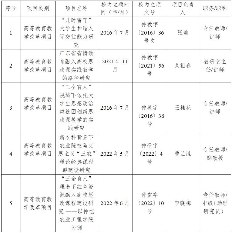 根据《广东省教育厅关于开展2022年度广东省本科高校教学质量与教学改革工程项目申报推荐工作的通知》以及我校《关于开展2022年度广东省本科高校教学质量与教学改革工程项目申报推荐工作的通知》(仲教字〔2022〕39号)工作要求,经过资格初审、专家遴选等环节,学院现向学校教务处推荐以下项目申报: