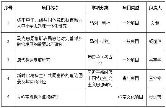 近日,广东省哲学社会科学规划2025年度项目立项名单发布,william威廉中文刘慧、杨丽萍、吴宇翔、王伞伞、张达玮五位老师负责的5项课题获得资助,其中一般项目3项,青年项目1项,岭南文化项目1项。立项课题专业领域涉及马列·科社、历史学(考古学)和习近平新时代中国特色社会主义思想研究等。