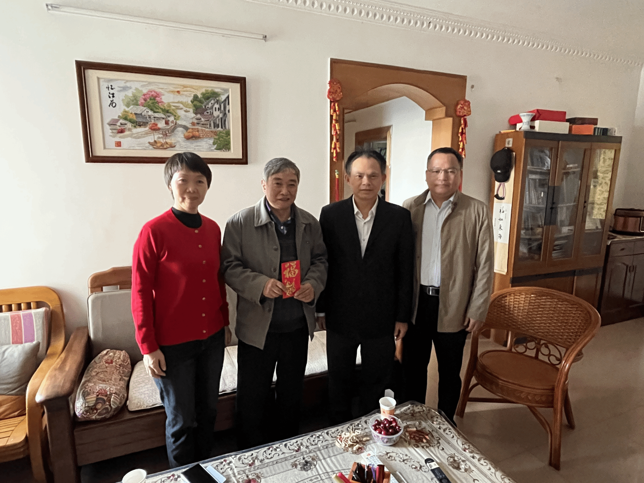 在2024年春节即将来临之际,为表达对学院退休的老党员和老教师的关心和爱护,弘扬中华民族尊老、敬老、爱老的传统美德,学院党总支和工会通过线上线下送祝福、走访慰问、召开座谈会等方式向已退休老党员和老教师表达节日问候,对生病的教职工进行慰问。