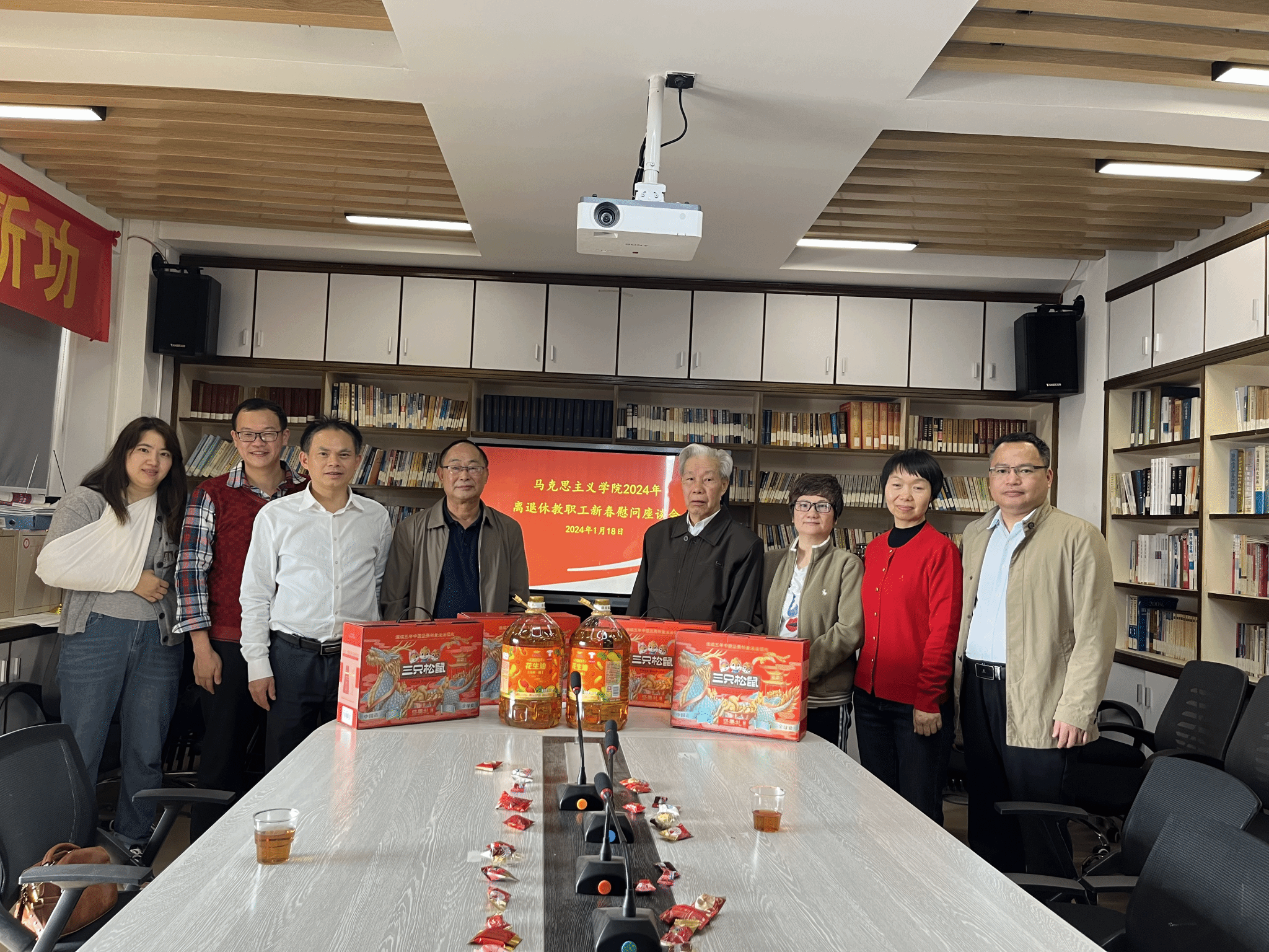 学院党总支和工会代表分成几个小组,分别开展春节慰问工作。对在校内的退休老党员和老教师进行了走访慰问,对身体较好的老师邀请他们到白云校区马院新办公地点来走一走、看一看,给老师们送去了节日的祝福和礼物。